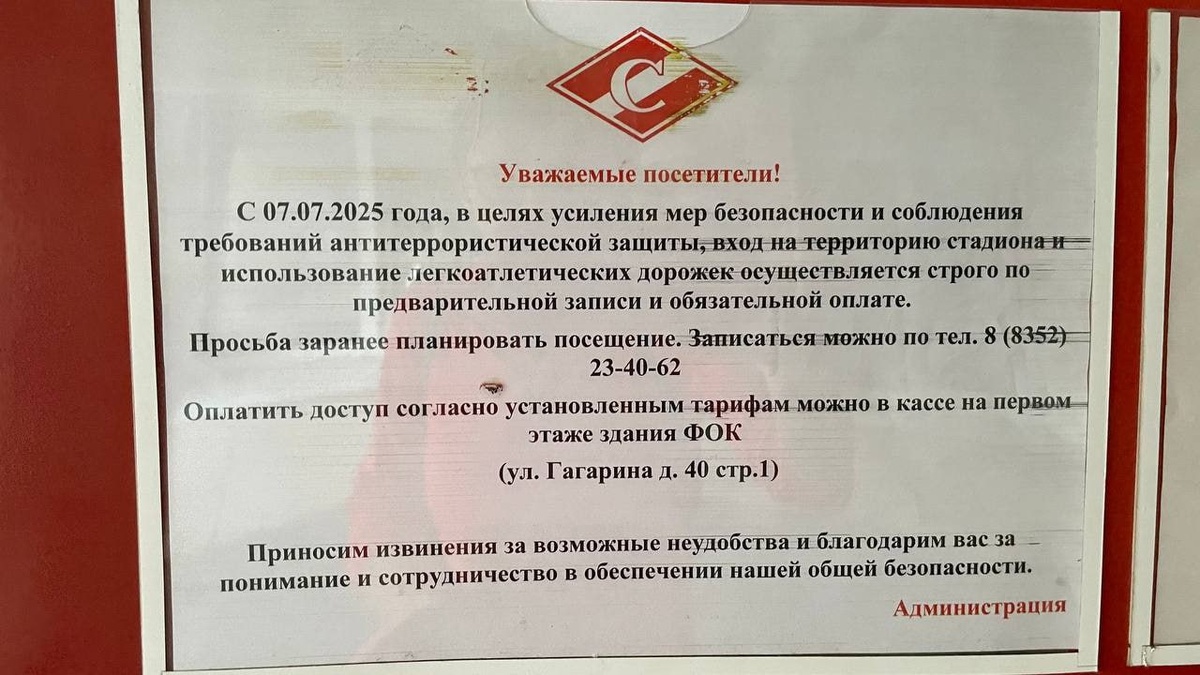 Начальник управления физической культуры и спорта мэрии Чебоксар Алексей Соловьёв сообщил журналистам, что такое решение администрация спортивного объекта приняла из-за «противодействия терроризму» и из-за предотвращения несанкционированной коммерческой деятельности. Решение якобы направлено на пресечение случаев, когда самодеятельные тренеры использовали территорию стадиона для организации платных занятий с группами без согласования с администрацией