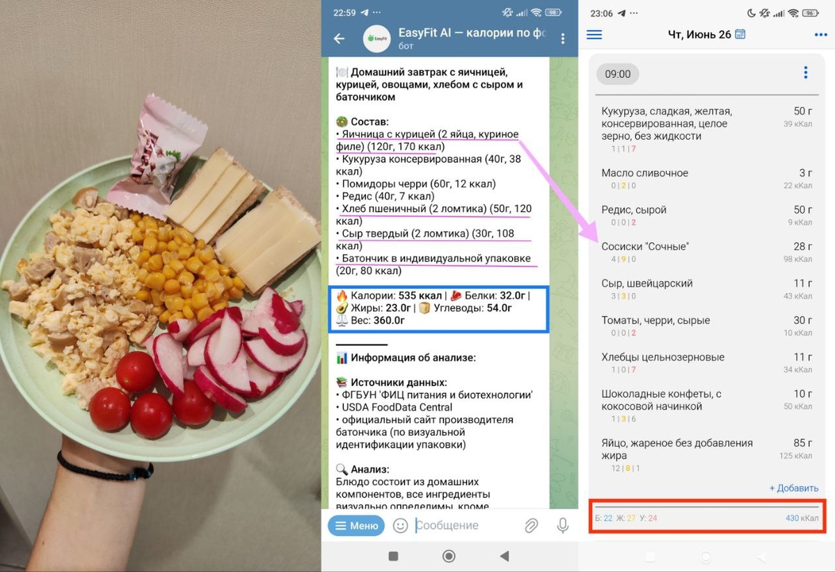 Примеры блюд (комментарии в голосовом) с кбжу подсчитанными ботом и приложением (ручной подсчет