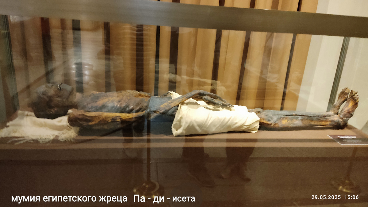 большая экспозиция, состоящая из артефактов разных периодов истории Древнего Египта от lV тыс. до н.э. и до рубежа н.э. Поделюсь некоторыми: 1) В Египетском зале хранится самая знаменитая мумия, замурованная в вакууме для сохранности. Знаменитой она стала после грандиозного открытия с помощью компьютерной томографии: в 2017 году учёные выяснили, что мумия является мужчиной, а не женщиной, как считалось ранее. И принадлежит она жрецу по имени Па-ди-исет. Тогда же учёные установили возраст жреца - 25 - 40 лет и некоторые физиологические особенности: скорее всего, он был кастрирован , имелись проблемы с зубами; выявили имеющиеся заболевания - артроз, проблемы с сердцем. Возраст мумии - около трёх тысяч лет. Древнеегипетские саркофаги хранили сведения об умерших: имена "владельцев", их родителей, статус в обществе. Необычная форма саркофага привлекла внимание учёных. Они выяснили, что он принадлежит женщине из состоятельной семьи, по имени Бабат, её статус - "госпожа дома" и "благоро