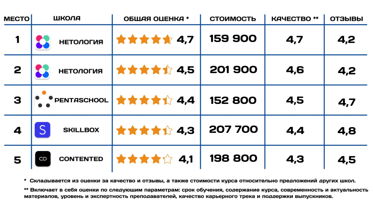 - Отзывы. Изучили актуальные отзывы на школы и курсы на официальных сайтах и на независимых площадках. Для всех программ кратко описали плюсы и минусы.