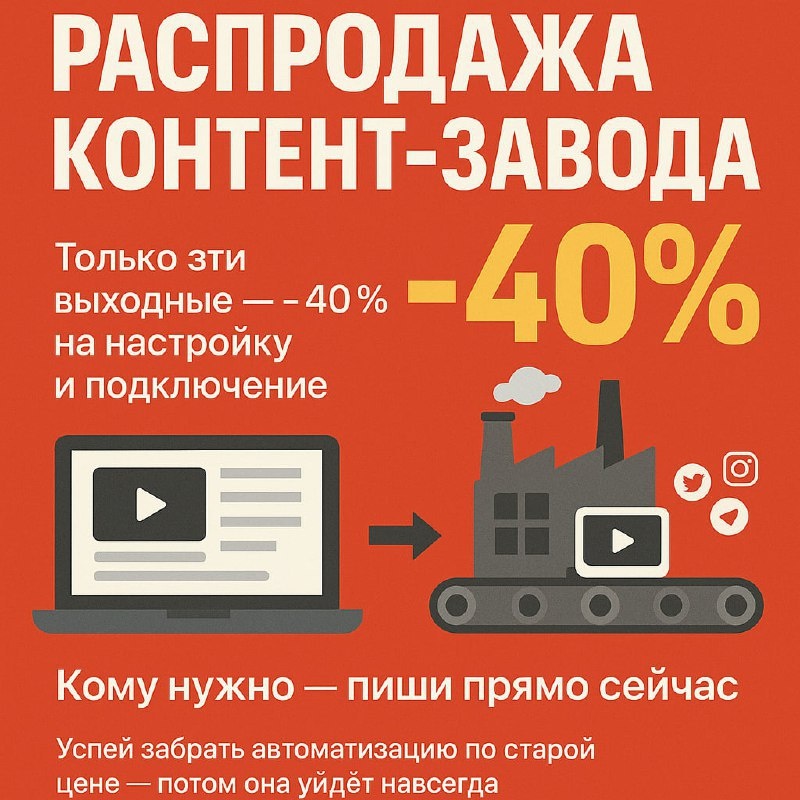 🔥 РАСПРОДАЖА КОНТЕНТ-ЗАВОДА — МИНУС 40% Эти выходные я наконец-то отдыхаю — и решил сделать подарок для тех, кто ещё не успел автоматизировать свой контент. 💻 КОНТЕНТ-ЗАВОД — это мой авторский конвейер, который превращает любой текст, ссылку или голос в готовое видео с субтитрами и обложкой — и сразу публикует всё в соцсети. Работает без выходных, даже когда я сплю. Честно: сейчас вижу, что большинству хватает простых автоматизаций — и КОНТЕНТ-ЗАВОД нужен 1 из 10. Поэтому распродаю всё, что осталось! 📌 Только эти выходные — -40% на настройку и подключение. Смотри скрин – там всё наглядно. Получить доступ можно тут. ✅ Клиентский чат ✅ Видеоинструкции ✅ Шаблоны + бесплатное обновление Успей забрать автоматизацию по старой цене — потом она уйдёт навсегда. Что думаешь по этому поводу? Пиши в комменты! #автоматизация | ВСЁ ПРО AI | AI NEWS | Дзен | ОК