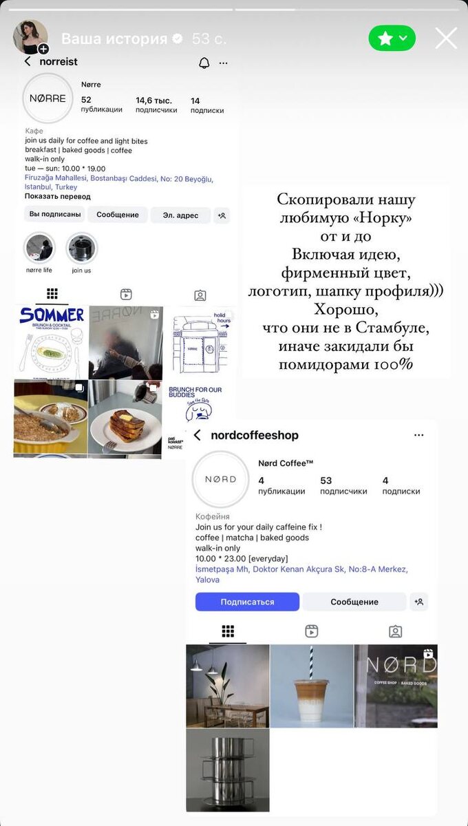 На дворе 21 век… Люди продолжают копировать настолько открыто) Решила поделиться, потому что кафе Norre (зовем с Олегом Норка😀) нами и вами любимая душа, место встреч, ребят люблю безумно и комьюнити у этого места со всего мира. Комментарии закрыли, заблокировали команду кафе и их гостей, которые пишут, также блокируют, им сложно оставаться не замеченными в этой ситуации. #стамбульскиебудни