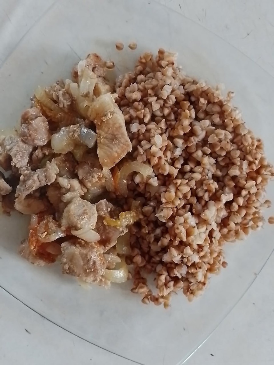 Свинина с гарниром из гречки Ингредиенты: Свинина 500 гр Лук 3 шт. Помидоры 3 шт. Растительное масло (для жарки) 50 гр Вода 1 ст. Перец черный молотый и паприка по вкусу Соль по вкусу Для гарнира:: Гречка 1 ст. Вода 2 ст. Соль по вкусу Приготовление: Мякоть свинины нарезаем на небольшие кусочки. Наливаем на сковороду растительное масло и хорошо разогреваем. Выкладываем в масло кусочки свинины, обжариваем их. Лук чистим и режем полукольцами, добавляем его к обжаренной свинине. Перемешиваем и обжариваем всё до мягкости лука. Помидоры, можно взять свежие, я взяла замороженные, остатки с прошлого сезона. Итак, режем помидоры на кусочки и добавляем их к мясу с луком. Всё солим, перчим и добавляем паприку. Перемешиваем. При необходимости добавляем воду и тушим под крышкой до готовности. У меня было достаточно своей жидкости с мяса и с томатов, поэтому я обошлась без воды.