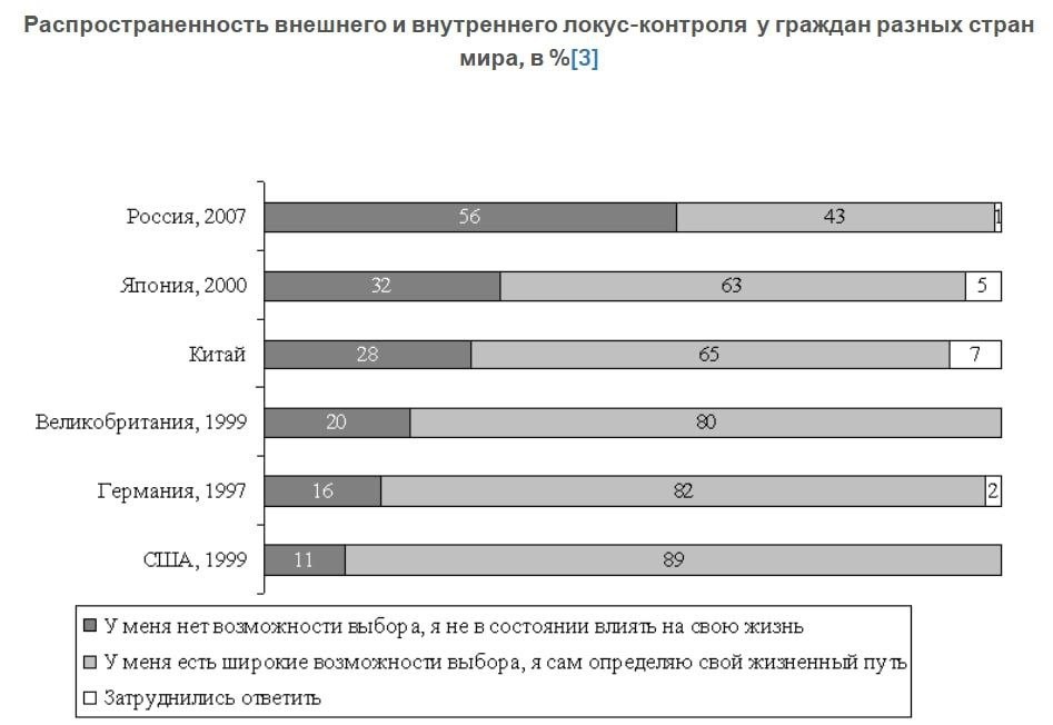 Локус контроля, или почему во всем виноват Путин. Часть 2/2. Ни один человек не имеет исключительно внешний или внутренний локус, но один из видов может доминировать. Исследование Института социологии РАН 2008 года показало, что среди россиян превалирует внешний локус контроля - 56% убеждены, что у них нет возможности выбора, и они не в состоянии повлиять на собственную жизнь. Примечательно, что в 1990 году так считали лишь 38% россиян. Где-то я читал (ссылку не нашёл), что к 2022 году доля жителей России с экстернальной установкой выросла уже до 70-75%. Судя по всему, это реакция на перемены в обществе, технологиях, культуре, одна из форм психологической защиты от неопределенности. Полностью верной не является ни одна из крайностей. Обстоятельства и другие люди играют роль в нашей жизни, однако многое зависит от нас самих. Гармоничный «локус контроля» — это баланс обеих установок. Ведь в одной ситуации причиной победы или поражения являются только наши поступки. В другой же ситуа