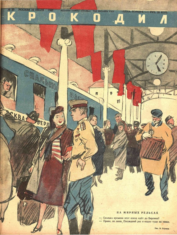 Виталий Горяев (1910—1982). «На мирных рельсах. — Сколько времени этот поезд идёт до Берлина? — Право, не знаю. Последний раз я ездил туда на танке».