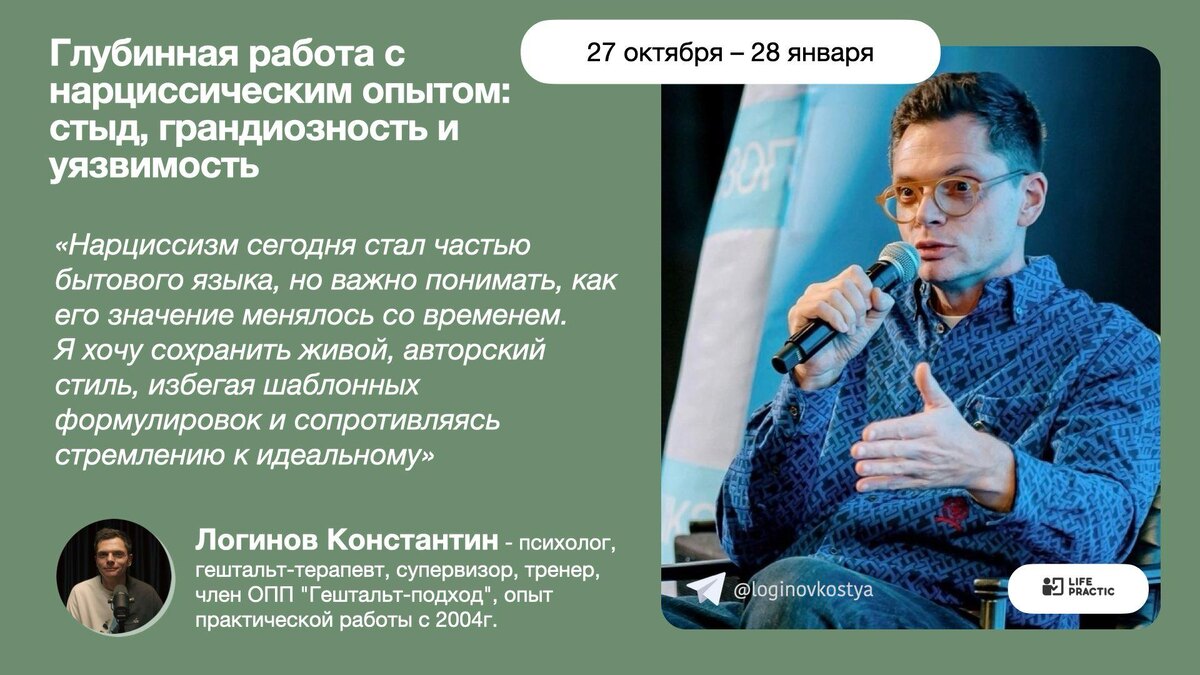 Вчера на презентации курса о нарциссизме я приводил список критериев, свойственных людям с нарциссическим опытом. Постарался изложить его человеческим языком. Многие нашли в нём себя. Это здорово, потому что иначе немного утомляет патологизация нарциссизма. Вы точно нарцисс 😁, если: • Ожидаете к себе исключительного обращения; • Испытываете ощущение внутренней неудовлетворённости; • Склонны манипулировать окружающими в своих интересах; • Болезненно реагируете на замечания; • Часто погружены в мечты о влиянии и контроле; • Не способны конструктивно решать разногласия; • Чувствительны к оценкам и малейшему осуждению; • Бываете чувствительны к мнению окружающих; • Вы привлекательны для тех, кто чувствует себя неполноценным и ищет любви. #курснарциссизм #psyloginov #константинлогинов