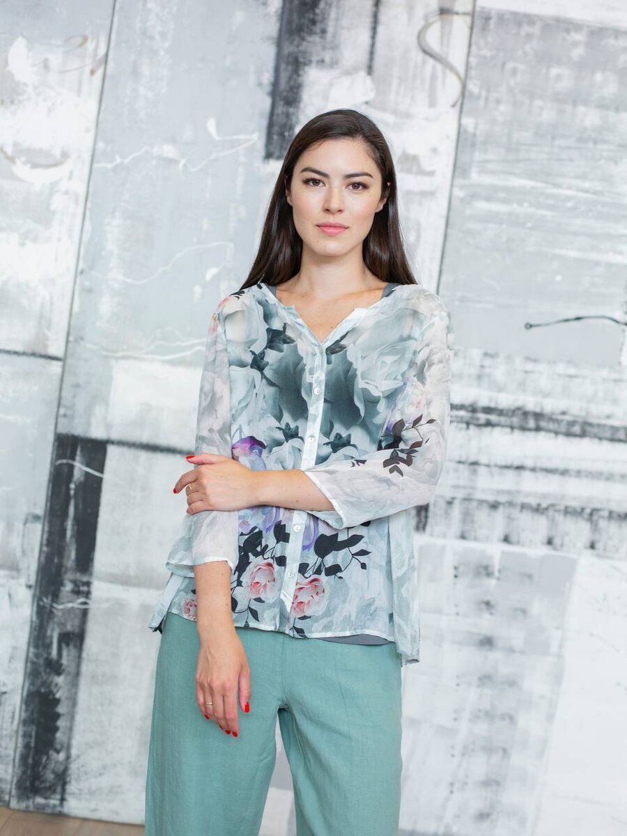 Легкий летний образ в мягкой цветовой гамме: нежно-голубая блуза с акварельным цветочным принтом от SIMCLAN выполнена из 100% вискозы