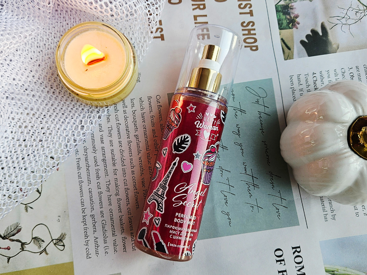🔸️Парфюмированный мист для тела с шиммером Angel Secret от Delta Parfum🔸️ Лето требует летних ароматов, блеска и изысканности даже на банальных прогулках с ребенком. Почему бы не сиять в песочнице у дома? 😁 Лааадно, ладно. Проще буду. Просто хочется чего-то нового и летнего. А мист для тела идеально подходит для этих целей. А если он с шиммером - вдвойне идеально. Серию мистов углядела у нас в SuperMage. Таким средством ни разу не пользовалась, поэтому нужно было срочно пробовать. Очень часто слышу от знакомых, что мист с шиммером придает сияние коже и что это сейчас трендово, модно. Я за модой не гонюсь, но ради интереса захотелось. 🔸️Объем: 150 мл 🔸️Цена: 250- 350 руб 🔸️Где купить: SuperMag, Ашан, маркетплейсы 🔸️Бренд: DELTA COSMETICS Флакон выполнен в стильном и привлекательном дизайне, который радует глаз. Картинки на этикетке очень "вкусные", яркие. Есть вся нужная информация. Производители обещают, что аромат произведен в Германии. Будем верить на слово✔️. У флакона хоро
