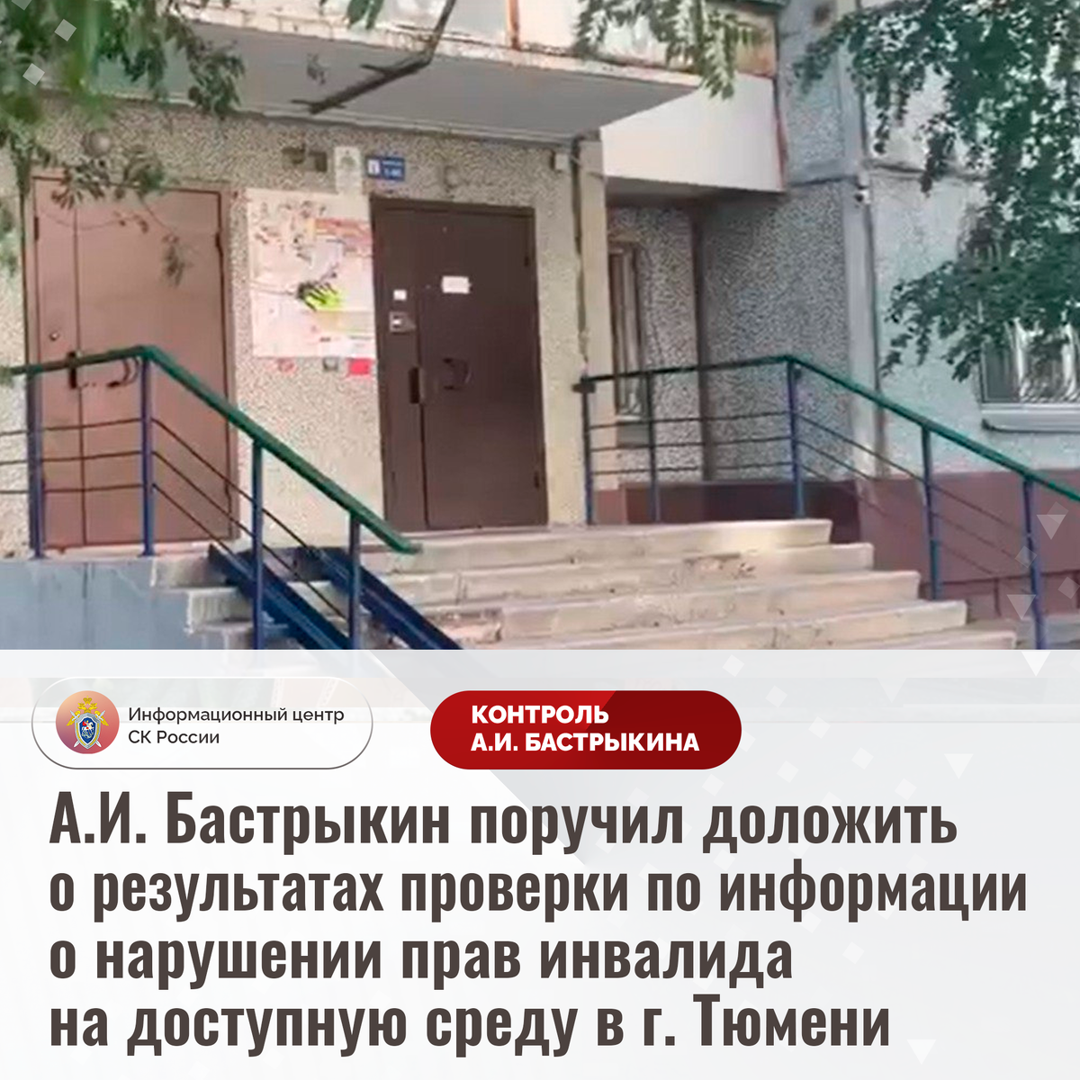 А.И. Бастрыкин поручил доложить о результатах проверки по информации о нарушении прав инвалида на доступную среду в г. Тюмени В социальной сети сообщается о нарушении прав жительницы города Тюмени, являющейся инвалидом. Входная группа и лестничные марши в многоквартирном доме на улице Муравленко не оборудованы подъемным механизмом, пандус находится в непригодном состоянии, в связи с чем девушка на протяжении четырех лет не имеет возможности самостоятельно выйти на улицу. Для посещения медицинских и иных социальных учреждений ее пожилая мать вынуждена обращаться к услугам грузчиков, что для нее финансово затруднительно. Отмечается также, что на протяжении длительного времени девушка состоит в очереди на улучшение жилищных условий, однако мер к реализации ее прав не принимается. Многочисленные обращения в компетентные органы результатов не принесли. В СУ СК России по Тюменской области организована процессуальная проверка. Председатель Следственного комитета Российской Федерации Александр