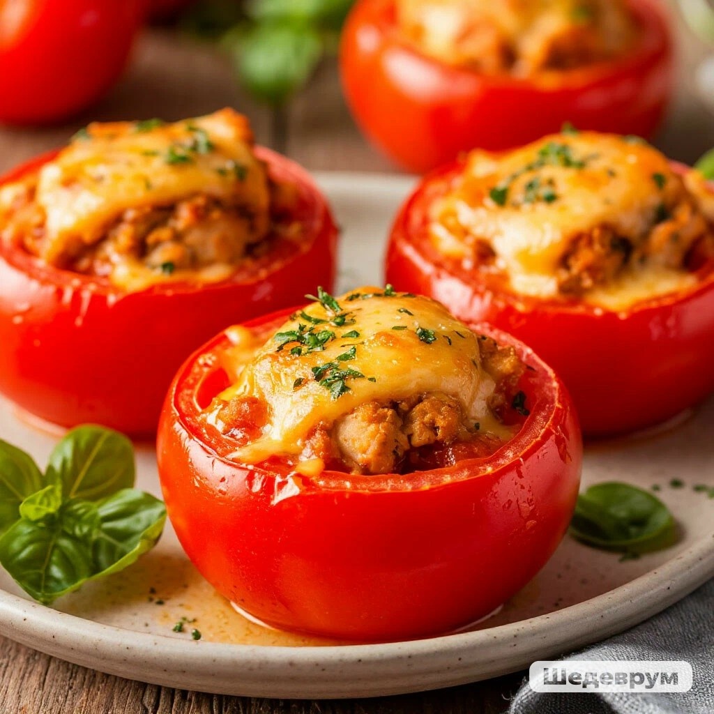 Представьте: сочные томаты, наполненные ароматной куриной начинкой с пряными травами и сыром… Звучит аппетитно? Тогда этот рецепт точно для вас! Фаршированные помидоры — это не только красиво, но и невероятно вкусно. Они станут идеальным блюдом для семейного ужина, праздничного стола или даже полезного перекуса. Аккуратно срежьте верхушки томатов и ложкой выньте мякоть (её можно использовать для соуса или добавить в начинку). Посолите внутри и оставьте на 5 минут, затем переверните, чтобы стек лишний сок. - Куриное филе отварите до готовности и мелко нарежьте (или пропустите через мясорубку). - Лук и чеснок обжарьте до золотистости. - Смешайте курицу, лук, чеснок, сметану, тертый сыр и зелень. Добавьте специи по вкусу. Наполните помидоры начинкой, сверху можно посыпать еще сыром. Выложите в форму и запекайте 20-25 минут при 180°C до румяной корочки. Фаршированные помидоры с курицей – это просто, вкусно и эстетично! Попробуйте приготовить и удивите близких новым кули