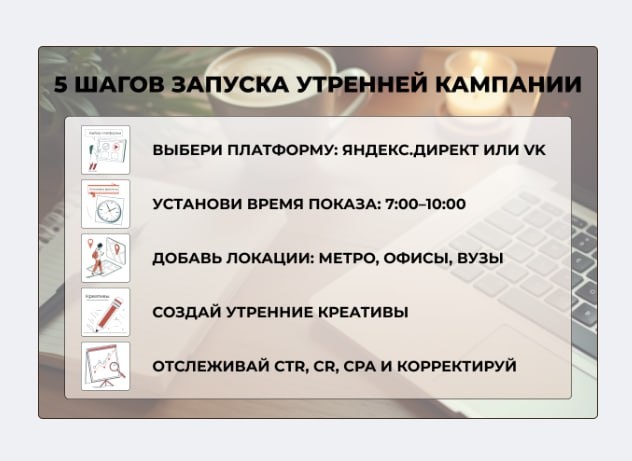 Интресный подход с показом рекламы для кофе и завтраков на вынос в утренние часы. Вспомнились корректировки по погоде в Директе, чтобы в дождь рекламировать зонты и дождевики. Конечно, там на самом деле больше применений этой настройки. Сходу приходит в голову реклама доставки обедов с 11 до 14 часов. Реклама клининга утром в выходные. Реклама местного бара вечером с четверга по субботу. https://ppc.world/articles/gde-kofe-trigger-povedencheskiy-targeting-po-utrennim-patternam-polzovateley/