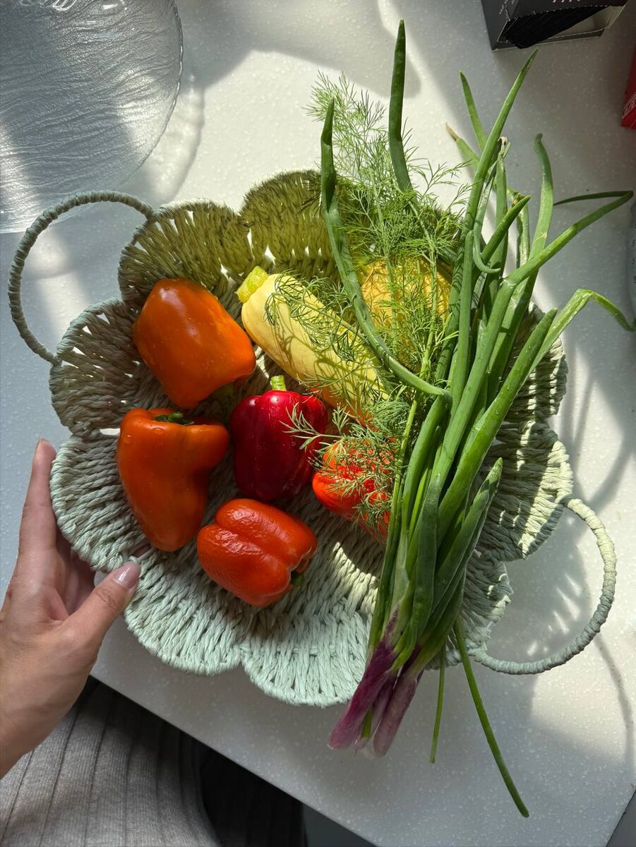 Красивая корзинка и первые свои овощи Кстати покупала ее в фикс прайс, там такая же в соломенном цвете была еще, основание металл, прочная, не хлипкая и очень красивая 🌿 иногда фикс это прям находка 🤗