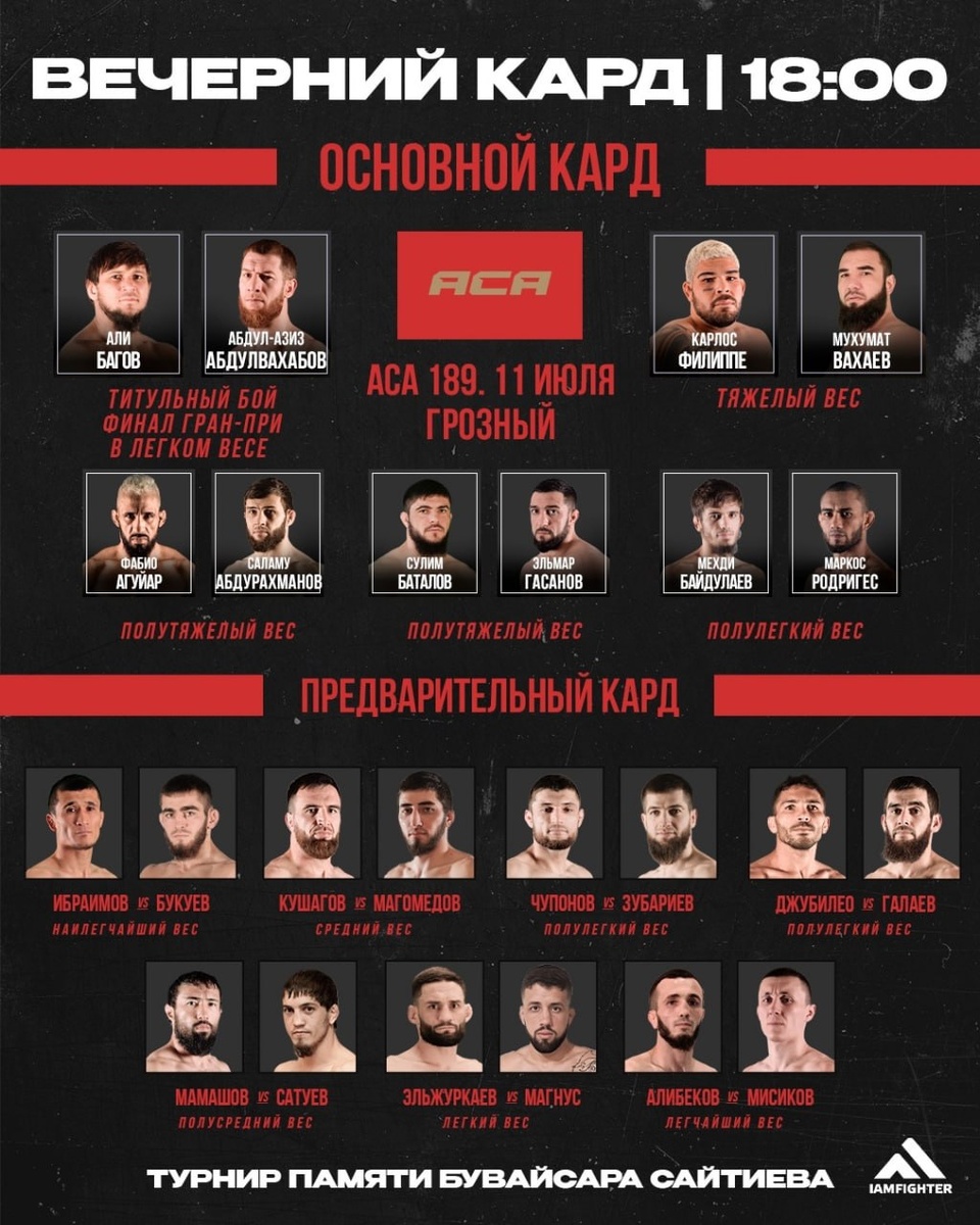 АСА 189: Абдулвахабов vs Багов Турнир АСА 189 посвященный памяти Бувайсара Сайтиева проходит в Грозном 11 июля в волейбольном дворце им. Увайса Ахатаева. Вход свободный. Смотреть бесплатную трансляцию турнира АСА 189 Супер турнир разделен на две части: утренний (начало в 11:00) и вечерний (начало в 18:00). Ивент возглавит финал гран-при в легком весе, чемпионский бой: Абдулазиз Абдулвахабов - Али Багов. * Титульный поединок в полутяжелом весе между Адланом Ибрагимовым и Муслимом Магомедовым отменен, ввиду проблем со здоровьем у Ибрагимова. Подпишись, чтобы не пропустить