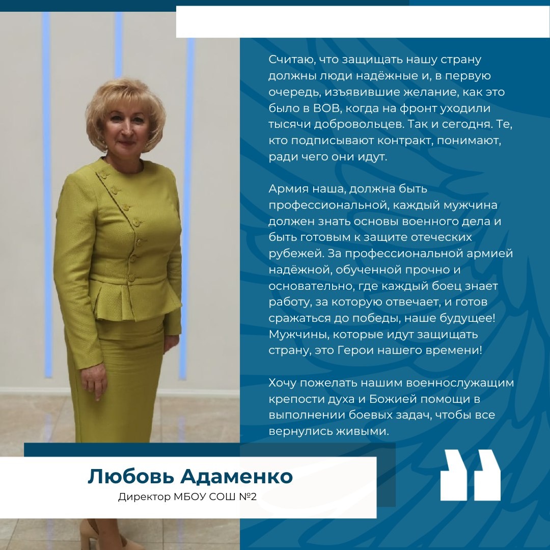 🇷🇺"Мужчины, которые идут защищать страну, это Герои нашего времени!" - считает Любовь Адаменко, директор МБОУ СОШ №2
