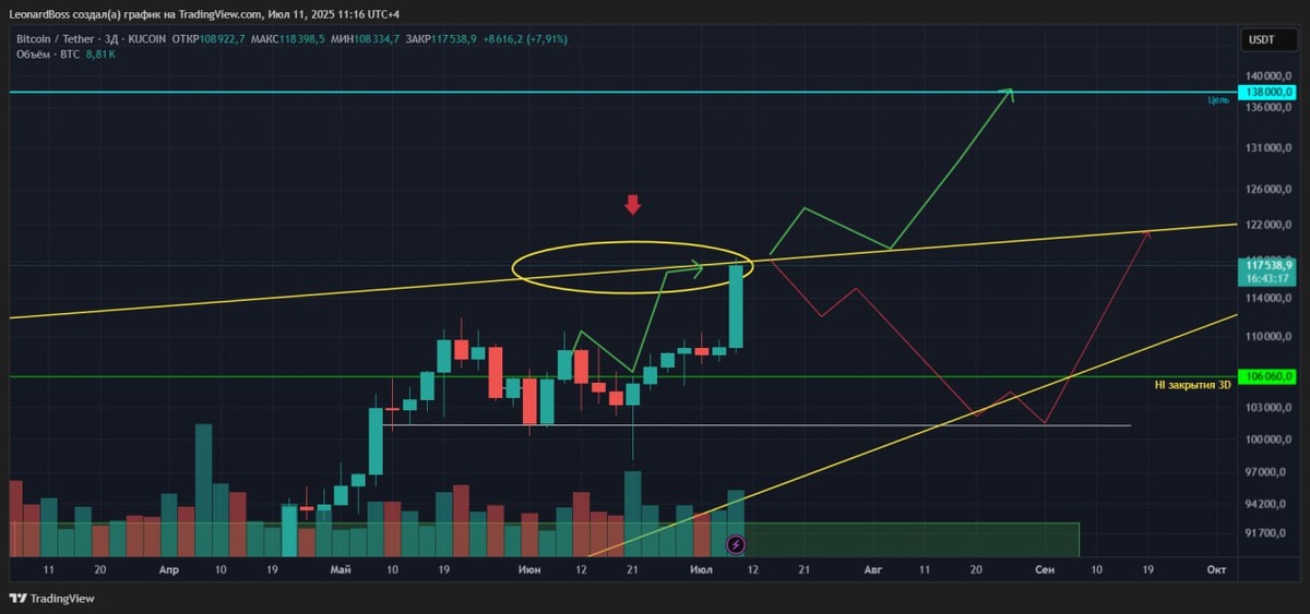 В ответ на пост #BTC 🔼ATH+ATH+ATH🔼 Доброе и зелёное утро, коллеги! Уверен, что настроение у вас не просто великолепное, а еще и мотивирующее на новые свершения!!) ⚠️Представил вам на рассмотрение 3 графика BTC со старших ТФ, и все эти графики вы с легкостью узнаете. 1й график с 3D ТФ достаточно четко характеризует движение глобального сценария. 2й график я сопровождаю все последние дни и он идеально передает картину локальную, 3й график закрепляет глобальную ситуацию и остужает FOMO у желающих запрыгивать в уходящий поезд налету!! ⚠️Итак, во-первых, я нас всех поздравляю с новым движением цены битка, поскольку это приближает наш масштабный профит на альтах. Во-вторых, в очередной раз коллеги, вы видите, что владея ТА в трейдинге, есть возможность прогнозировать вероятное движение цены и на этом зарабатывать деньги. И в-третьих, для тех, кто только начинает двигаться в трейдинге: если вы перечинаете все посты по тегом #BTC начиная со второй половины мая, в логической последовательн