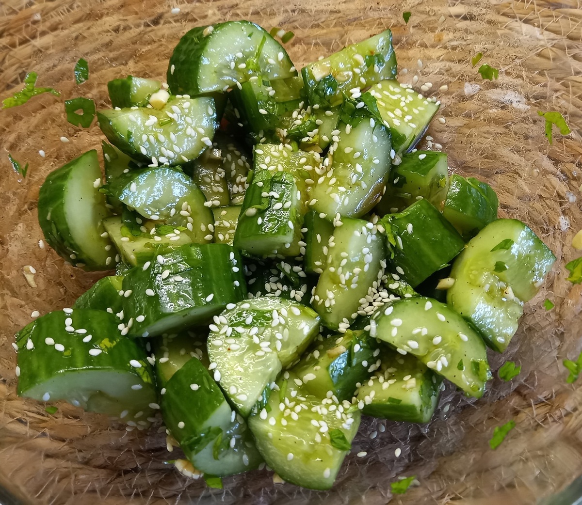 соль, кунжут Начинаем: давим огурчики ножом, чтобы они треснули, затем режем их на кусочки. Огурчики перекладываем в отдельную миску, хорошо посыпаем солью, оставляем отдыхать минут на 10, чтобы они дали сок. Займемся заправкой: Чеснок и зелень мелко порубить, смешать с соевым соусом, рисовым уксусом, сахаром, маслом и сладким чили. Сладкий чили у меня двух видов: на вкус они различаются и я добавляю их оба в равной пропорции Все хорошенько перемешиваем, пробуем на вкус. Это главный элемент в