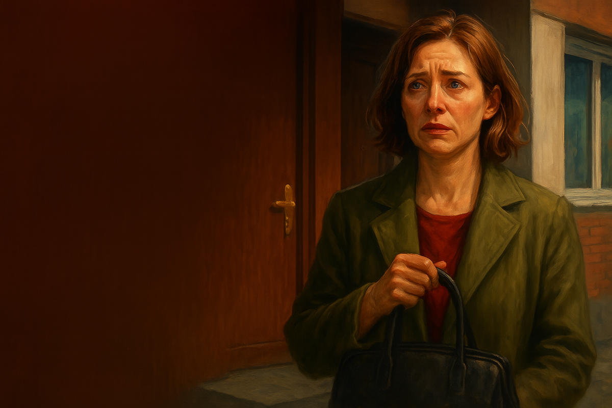 На пороге — пауза. Ещё секунда. Взгляд по сторонам. Хлеб на столе, её пальто на спинке стула, график на холодильнике. Всё это больше не про неё.