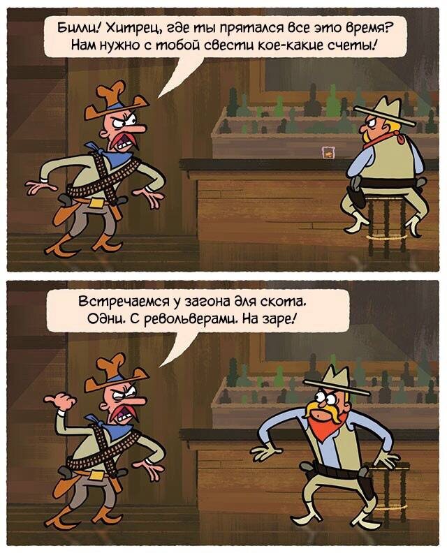 Сейчас уже кажется каким-то странным, что когда-то были так популярны фильмы и литературные произведения, посвящённые противостоянию индейцев и ковбоев и Дикому Западу в целом. На сегодняшний день дуэли русского дворянства 18-19 веков выглядят, на мой взгляд, куда более романтичными и интересными. Всё же некоторый трепет к этой тематике укоренился во мне с детства. Когда, я ещё играл в солдатиков, моей любимой фигуркой был ловкий индеец, а фильм "Человек с бульвара Капуцинов" до сих пор остаётся одним из самых любимых (хотя это наверное больше благодаря обаянию Андрея Миронова, Николая Караченцова, Олега Табакова и других гениальных советских актёров, задействованных в картине). Короче! Тема вестернов, хоть и стара, и на данный момент не популярна, в юмористических комиксах встречается нередко. И сегодня я предлагаю тем, кто постарше (как и я), немного поностальгировать по временам, когда нам это всё нравилось. А остальным просто посмеяться. Ведь приколы там довольно простые и понятн