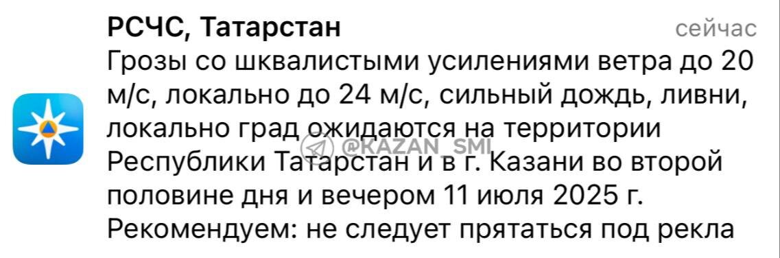 Несмотря на жару в +35°С, МЧС предупреждает о грозе со шквалистым ветром до 20 м/с и ливне днем и вечером 11 июля.