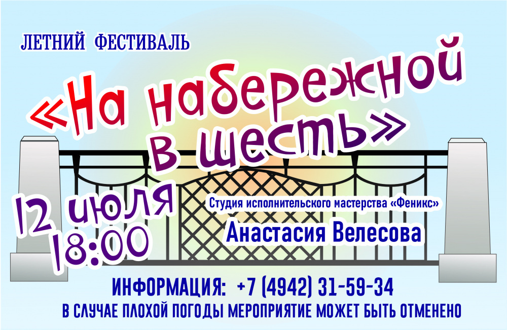 Костромичей и гостей города приглашают на традиционный летний фестиваль «На набережной в шесть» В эту субботу, 12 июля, жителей Костромы и гостей города приглашают на набережную реки Волги. С 18:00 там будут звучать всеми любимые известные хиты в живом исполнении. В городе продолжает работу полюбившийся многим летний фестиваль «На набережной в шесть». Гостей ждет встреча с эстрадной певицей и солисткой студии исполнительского мастерства «Феникс» Анастасией Велесовой. Площадка фестиваля находится в районе причала №2. Напомним, что в рамках фестиваля «На набережной в шесть» все лето гостей ждут творческие номера от артистов и музыкальных коллективов города. Мероприятие проходит каждую субботу с 18:00 до 19:00, если позволяет погода. Дополнительную информацию можно получить по телефону 31-59-34.
