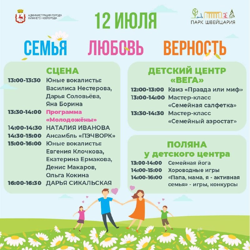ДЕНЬ СЕМЬИ, ЛЮБВИ и ВЕРНОСТИ отметят в парке 12 июля! И снова это будет праздник для молодоженов, семей с детьми разного возраста и всех, кто готов отметить этот день любви и верности друг другу. Самые креативные и смелые нижегородские пары решили сменить торжественный зал на не менее торжественный парк и вступить в брак в окружении зелени аллей «Швейцарии». 👰♀️🤵Романтичные моменты свадьбы - первый поцелуй и первый танец молодых - пройдут на главной сцене центральной площади. 🎶Затем – концерт, в котором примут участие Наталия Иванова, ансамбль народной песни «Пэчворк», Дарья Сикальская и юные солисты. 🎭На поляне у детского центра – игры для детей и родителей, хороводы в сарафанах и йога для всей семьи. И , конечно, мастер-классы в детском центре для всех желающих. Регистрация: 🎨«Семейная салфетка» 🎈«Семейный аэростат» ❓Квиз «Правда или миф?» 🧘🏼♀️Семейная йога 😄 Мероприятия Нижний Новгород. Я местный!