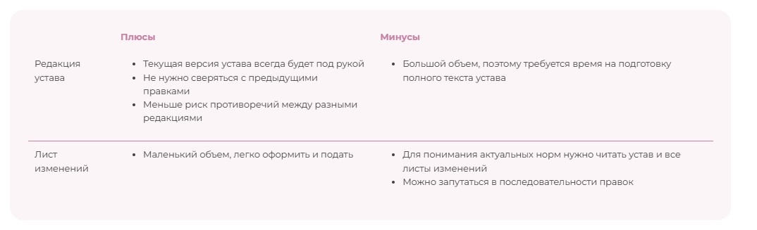 Для оформления правок доступно два варианта: принять новую редакцию устава или составить лист изменений — отдельный документ. В общем случае первый вариант предпочтительнее, поскольку позволяет внести существенные корректировки, касающиеся нескольких положений устава. Лист изменений подойдет только в том случае, если правки являются единичными. Но это не единственный критерий выбора. В таблице ниже представлены плюсы и минусы каждого варианта.