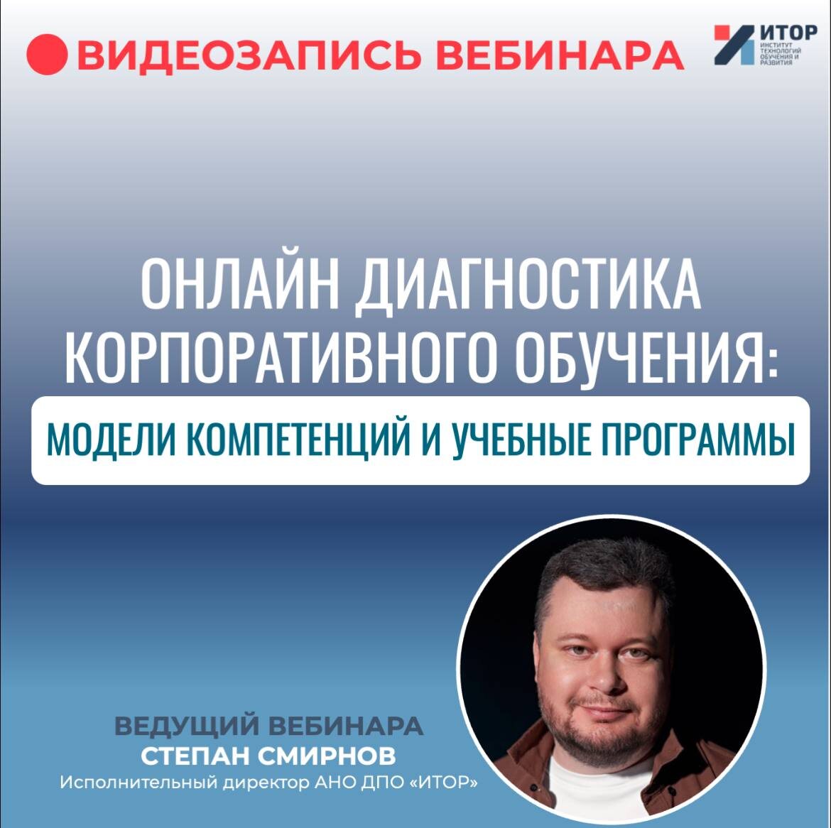 ВИДЕОЗАПИСЬ ВЕБИНАРА ОНЛАЙН-ДИАГНОСТИКА КОРПОРАТИВНОГО ОБУЧЕНИЯ Друзья и коллеги, мы хотим чтобы доступ к важной и нужной информации был у каждого из вас, поэтому делимся видеозаписью прошедшего вебинара Степана Смирнова. СМОТРЕТЬ ВЕБИНАР Мы ценим ваш интерес и стремление внедрять лучшие практики в корпоративное обучение. Основные моменты вебинара ✅Прошлись по ключевым аспектам того, как работать с моделями компетенций. ✅Ознакомились с базовыми методологическими предпосылками работы с моделями компетенций и учебно-методическими комплексами. ✅Сделали онлайн-диагностику модели компетенций и по ее результатам разработали план ближайших действий. ✅Сделали онлайн-диагностику учебно-методических комплексов. Увидели зоны роста и сформировали планы ближайших действий. В современном корпоративном обучении невозможно добиться выдающихся результатов без системного подхода. Модели компетенций и учебно-методические комплексы (УМК) — это два инструмента, которые кардинально меняют эффектив
