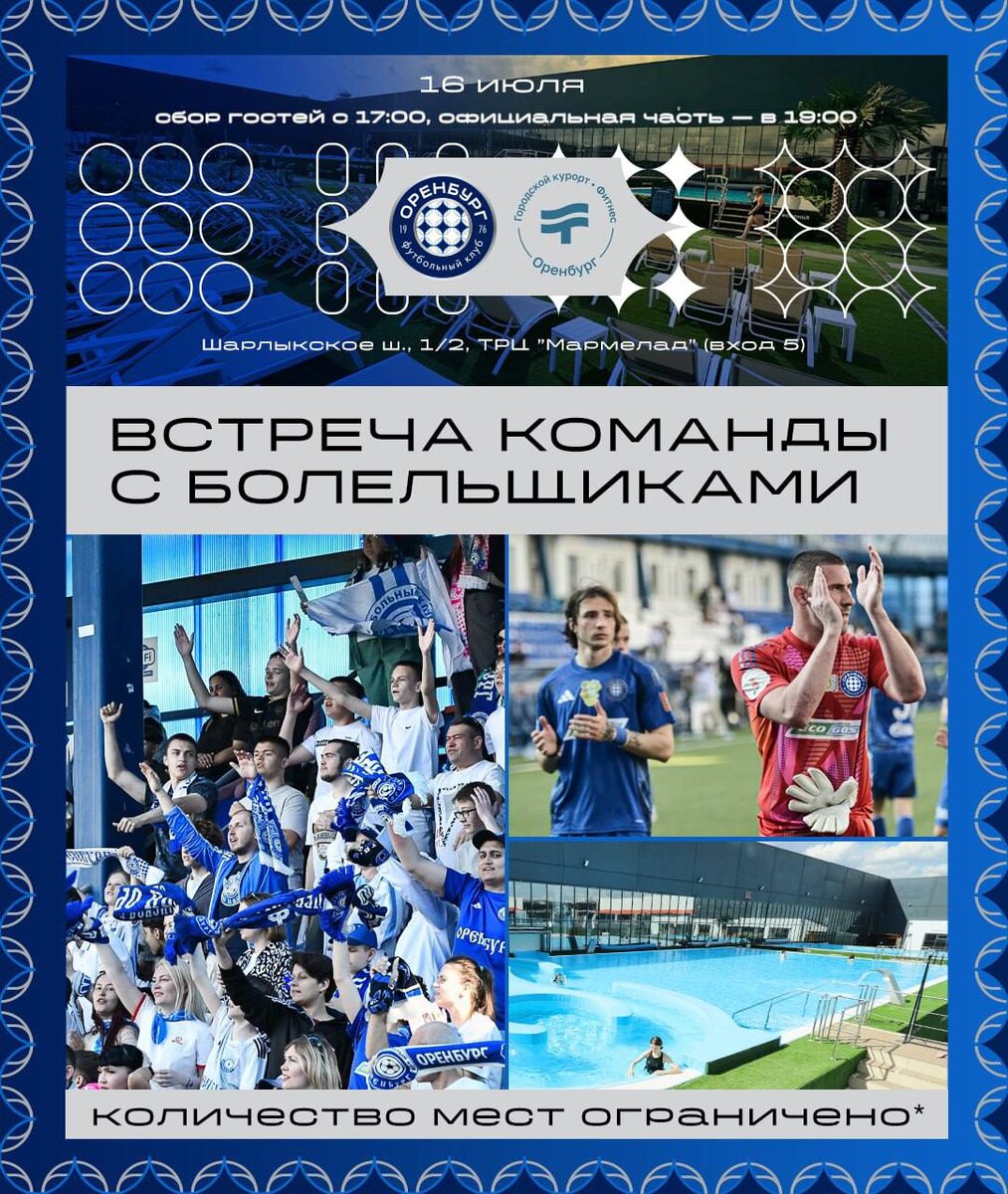 Самая тёплая встреча лета — с ФК «Оренбург» 💙 16 июля в Оренбурге прогнозируется +32°, лучшее место для встречи с командой в такую погоду — Термоленд 😉 С 17:00 — вы отдыхаете. С 19:00 — встречаетесь с командой. В программе встречи: ⭐️ Представление новичков команды ⭐️ Представление формы на новый сезон ⭐️ Сессия вопросов и ответов с футболистами и руководством клуба ⭐️ Специальные подарки ⭐️ Фото и живое общение с игроками И всё это — после погружения в мир бань, терм, бассейнов и спа, абсолютно бесплатно. Спеши оставить заявку по ссылке: https://clck.ru/3N4cBH 📍 Только 500 бесплатных мест. 📅 Заявки принимаем до 14.07, 18:00 (ОРБ) Будет жарко! #ФКОренбург