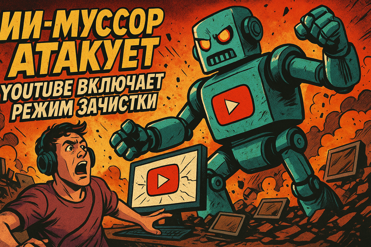 Вы когда-нибудь натыкались на видео, где пластиковый голос монотонно вещает поверх слайд-шоу из стоковых картинок? Где каждый кадр — как клон предыдущего, а сам ролик словно собран лоботомированным роботом за пять минут до сна? Поздравляю. Вы столкнулись с новой цифровой чумой — AI-slop, или, если по-нашему, нейрошлак. YouTube долго терпел. Он смотрел сквозь пальцы, как его лента превращается в бесконечную ленту фабричного контента, где клипы клепают быстрее, чем человек успевает зевнуть. Но, как в любом приличном вестерне, приходит момент, когда шериф встаёт, сдувает пыль с револьвера — и говорит: «Хватит». С 15 июля 2025 года YouTube начнёт зачищать и отключать монетизацию у каналов, которые штампуют видео без души. В центре внимания — низкокачественный ИИ-контент, сделанный по шаблону, без реального участия человека. Да-да, те самые тысячи видео, где вместо креатива — набор генеративных костылей: синтетический голос, нарезка из стока и ленивая закадровая моралька. Что же теперь? Про
