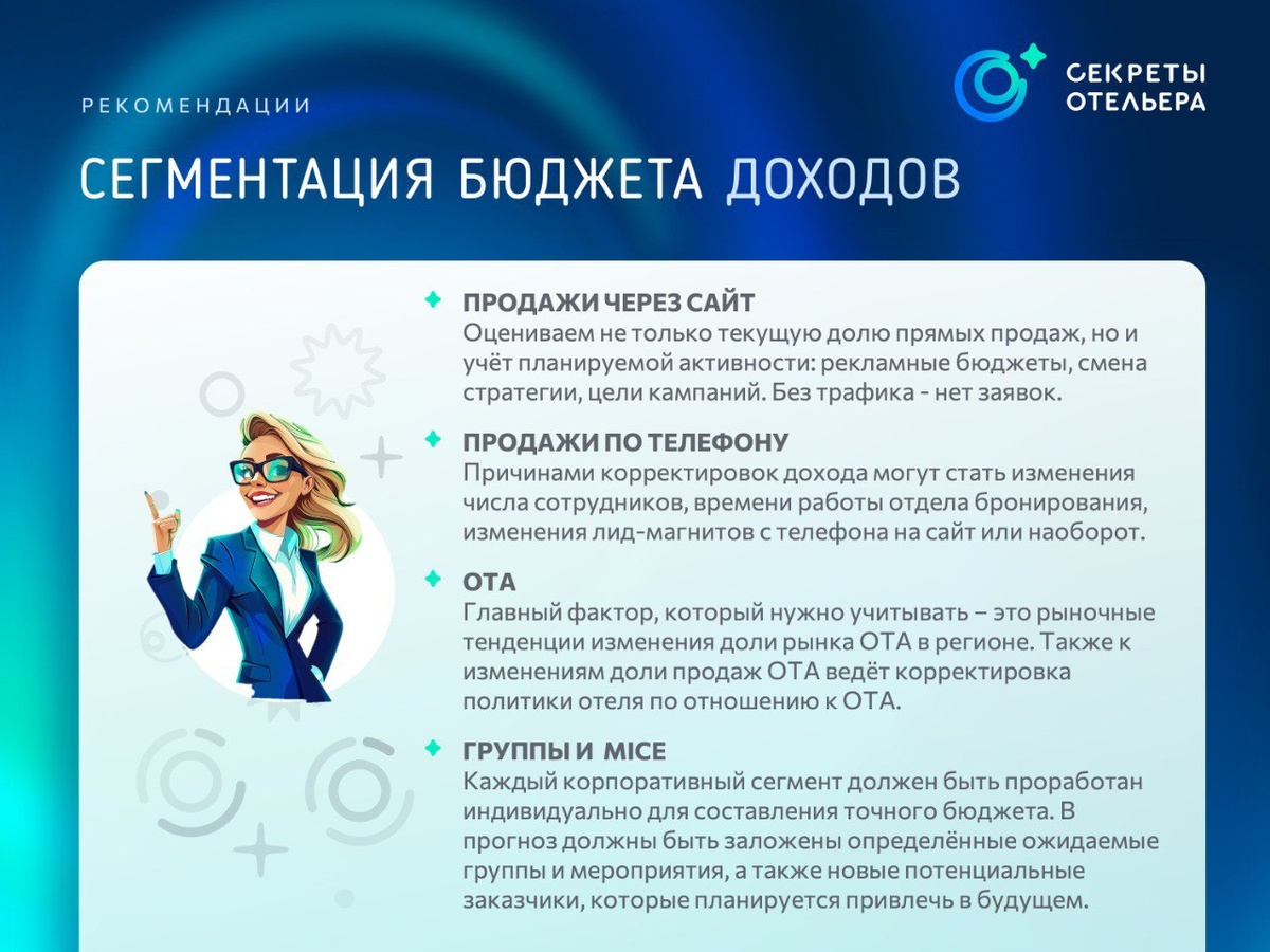 Вчера обсуждали подход к составлению бюджета. Сегодня - о том, как не промахнуться в деталях. Составляя бюджет по принципу "ну примерно будет так же, как в этом году", легко упустить факторы, которые прямо кричат: "так не будет". Например, нельзя закладывать рост прямых продаж с сайта, если отель в новом году не планирует вкладываться в рекламу. А ожидание новых групп - бессмысленно, если переговоры ещё не начаты или рынок ушёл в другую сторону. Чем точнее вы понимаете, что стоит за каждой цифрой, - тем проще потом не удивляться. Делимся тем, на что стоит обратить внимание при расчёте бюджета по основным каналам продаж.