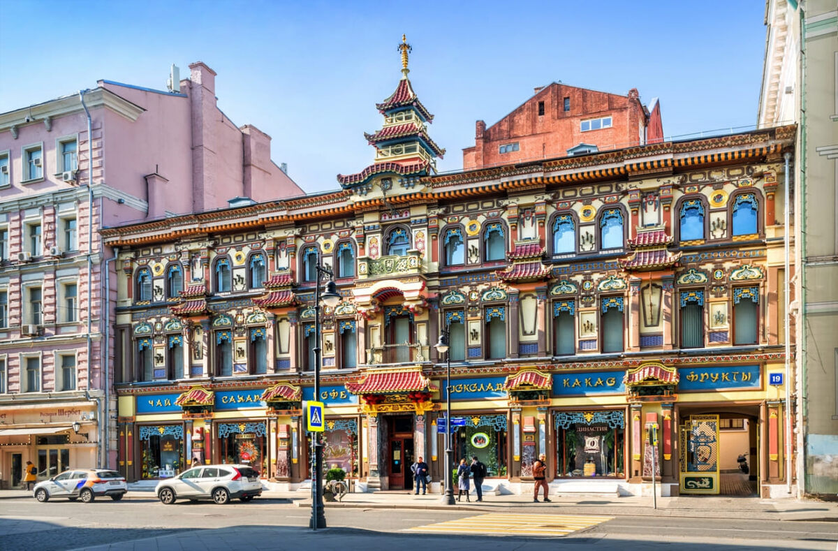 Если идти по Мясницкой дальше, вы точно заметите соседний дом — тот самый, с черепицей, драконами и надписями в китайском стиле. Выглядит он так, будто его сюда телепортировали из Китая. На самом деле это дом русской купеческой семьи Перловых. Одной из самых известных чайных династий дореволюционной России.