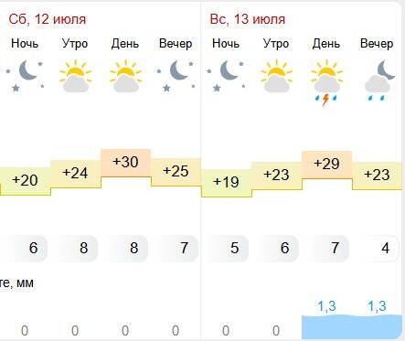 Даже ночью температура воздуха не опустится ниже 19-ти градусов Невыносимую жару и грозы обещают костромичам синоптики в эти выходные 12 и 13 июля. Температура воздуха даже ночью не опустится ниже отметки в 19 градусов. В субботу днем обещают +30 градусов. Вечером температура воздуха упадет лишь на пять градусов, к ночи — опустится до +20. В этот день осадков не предвидится. В воскресенье будет на 1-2 градуса прохладнее, чем днем ранее. После полудня ожидается гроза с ливнем. Осадки могут идти до конца дня. Мы рекомендуем местным жителям запастись солнцезащитным кремом из-за высокого уровня ультрафиолетового излучения. Также нужно пить больше воды, чтобы избежать обезвоживания.