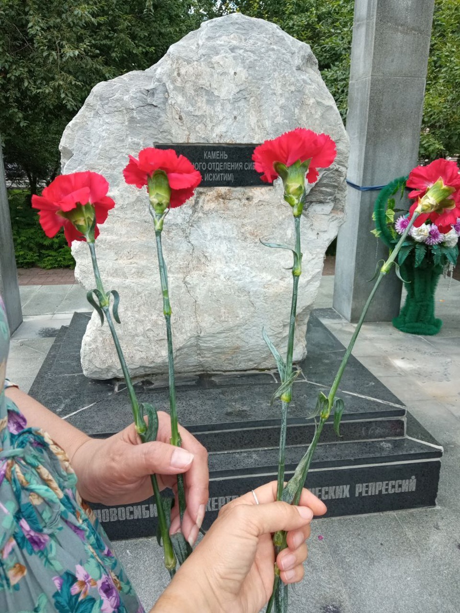Но сегодня мы с Еленой Шуваловой снова в Нарымском сквере, снова возлагаем цветы к памятнику жертв политических репрессий.