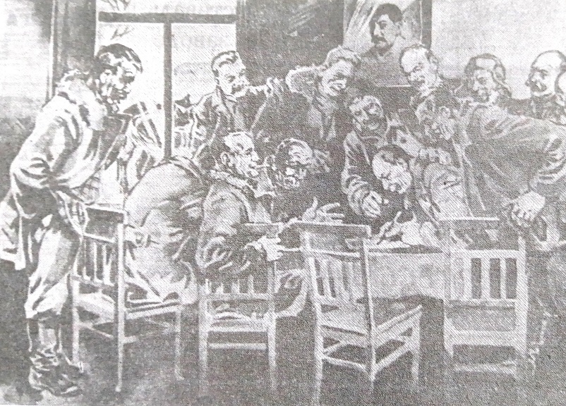 Итоговая репродукция картины художника Эдуарда Аусберга была помещена в газете «Молот» за 1936 год. Рисунок изображает, как колхозники-казаки станицы Цимлянской пишут письмо наркому иностранных дел СССР М.М. Литвинову.