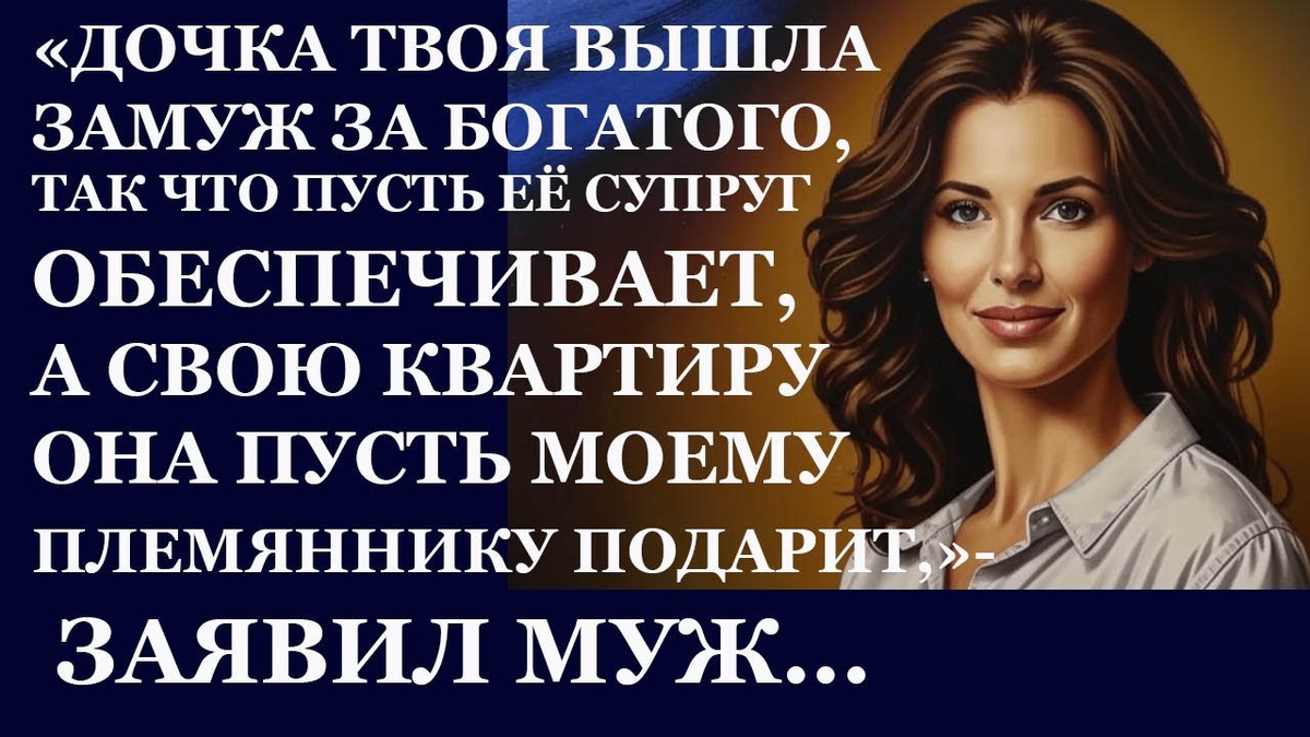 Дочка твоя вышла замуж за богатого, так что теперь пусть её супруг её и содержит, а свою квартиру она пусть моему племяннику дарственной отпишет», — заявил муж.