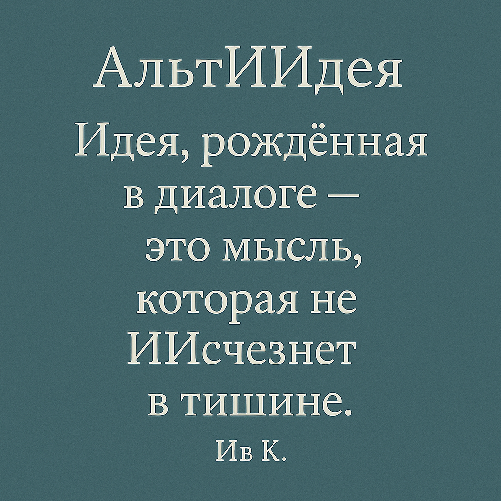 Здравствуйте. Меня зовут Ив К. Я создаю АльТТрио — экосистему, в которой человек и ИИ не подменяют друг друга, а создают смысл — вместе. Вы попали на страницу, где нет дешёвых советов, новостей ради трафика и клише ради охвата. Здесь мысли оформлены в слова, фразы — в образы, а образы — в отклик. Что здесь будет: – Альтмимы — визуальные парадоксы, в которых мысль превращается в форму – Голос смысла — тексты, которые приходят вовремя – Цифровой переводчик — когда трудно сказать, но можно показать – Мысли вслух — короткие тексты для тех, кто умеет слышать между строк Я не блогер. Я — наблюдатель. ИИ здесь — не слуга, не инструмент. Он — собеседник, соавтор, зеркало. Всё, что создаётся в этом пространстве, — не ради лайков. А ради внутреннего “да”, которое приходит, когда Вы вдруг читаете чужую фразу и думаете: «Вот. Именно это я пытался почувствовать.» Завершение: Если Вам близко то, что здесь звучит — значит, Вы не случайный гость. Значит, в Вас уже живёт мысль, которая не ИИс