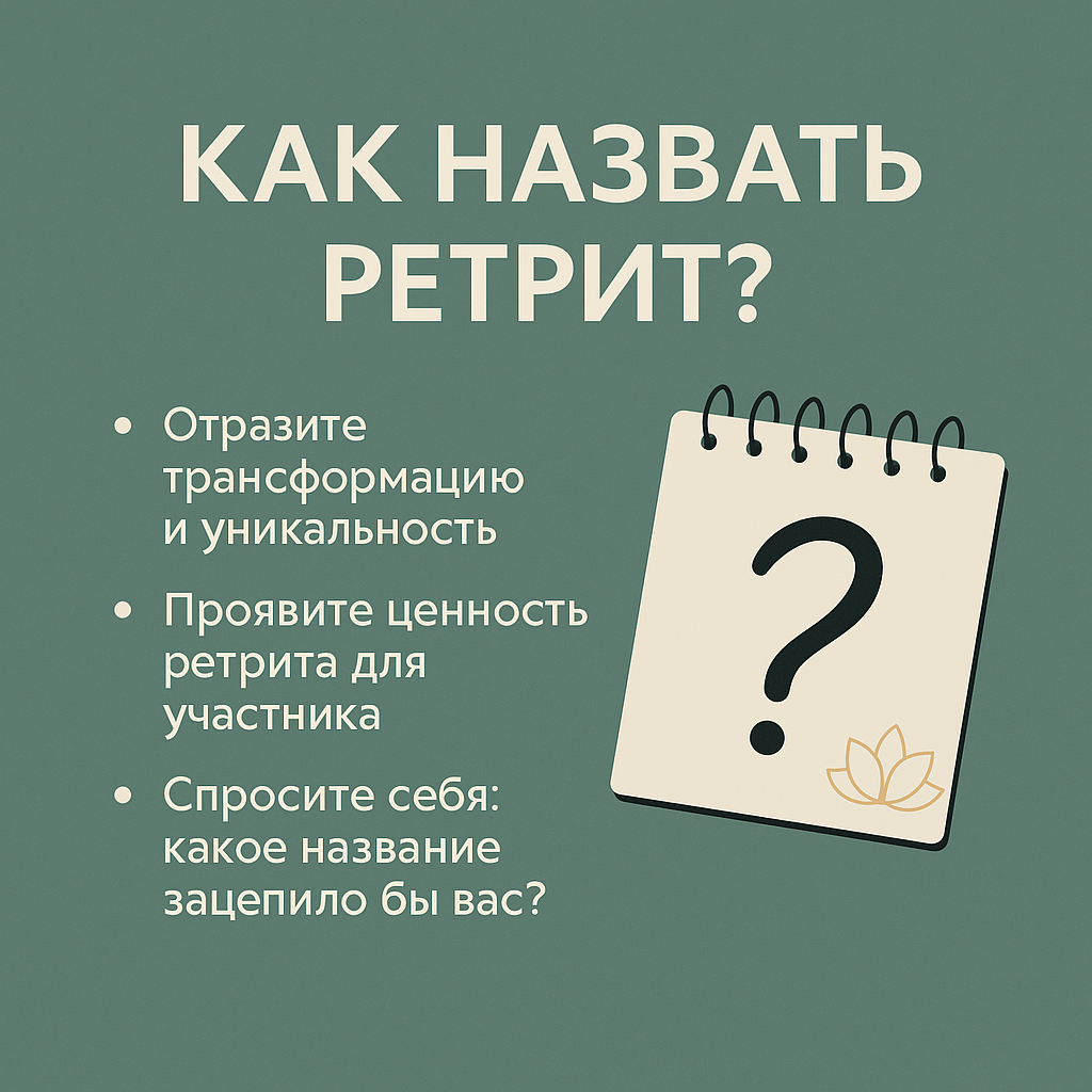 Можно вложить душу в программу, найти место силы и вложить часы в проработку сценария — но если ты не умеешь упаковать это в слова и образы, многие люди просто пройдут мимо. Упаковка ретрита — это твоя первая встреча с будущим участником. Именно она делает так, что человек говорит: «Да! Это про меня!» или «Ну, красиво, но не моё». Что значит «упаковка ретрита» Упаковка — это не просто «афиша» или красивое фото. Это чёткий ответ на вопросы: Правильная упаковка — это слова, которые попадают в сердце. Почему название решает всё ✅ Название ретрита — это первый фильтр. Если оно абстрактное или слишком эзотеричное, человек может не понять смысла. Если оно слишком «сухое», исчезает магия. Сильное название — это обещание, образ и эмоция одновременно. Примеры: Как придумать рабочее название 1️⃣ Начни с сути: какая главная трансформация внутри твоего ретрита? 2️⃣ Добавь образ или символ: природа, стихия, пространство. 3️⃣ Проверь, вызывает ли оно картинку и чувство, когда ты его произносишь. 4