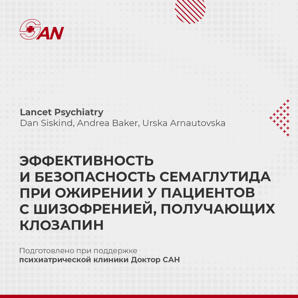 В журнале Lancet Psychiatry опубликованы результаты фазы II клинического испытания COaST, в котором оценивался эффект семаглутида у пациентов с шизофренией или шизоаффективным расстройством, находящихся на терапии клозапином и имеющих ожирение (ИМТ ≥26 кг/м²). Семаглутид достоверно снижал массу тела в среднем на 13,88 %, тогда как в группе плацебо снижение составило всего 0,42 %. Препарат не влиял на уровни клозапина/норклозапина в крови и не ухудшал психотические симптомы по шкале PANSS. Семаглутид был хорошо переносим, серьёзных побочных эффектов не зафиксировано; нечасто встречались запоры. Подробнее о лечении шизофрении: https://doctorsan.ru/lechenie-shizofrenii