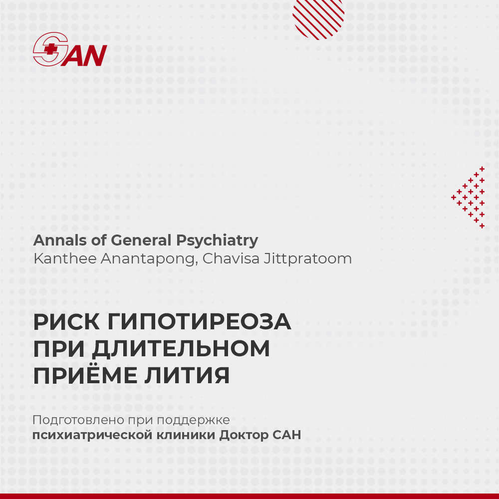 Журнал Annals of General Psychiatry опубликовал результаты ретроспективного исследования из Таиланда, в котором оценивалась частота и факторы риска гипотиреоза у амбулаторных пациентов, находящихся на долговременной терапии литием в течение 10 лет. За период наблюдения у 30 пациентов из 279 развился гипотиреоз (у 28 — субклинический), что соответствует 0,0212 случая на пациент-год. Гипотиреоз развивался в среднем спустя 14,4 месяца от начала приёма лития, с наибольшей частотой случаев в первый год лечения. Факторы риска: молодой возраст (каждый год снижает риск на 5%), наличие соматических заболеваний, высокие концентрации лития в крови. Источник: https://pubmed.ncbi.nlm.nih.gov/40542381/