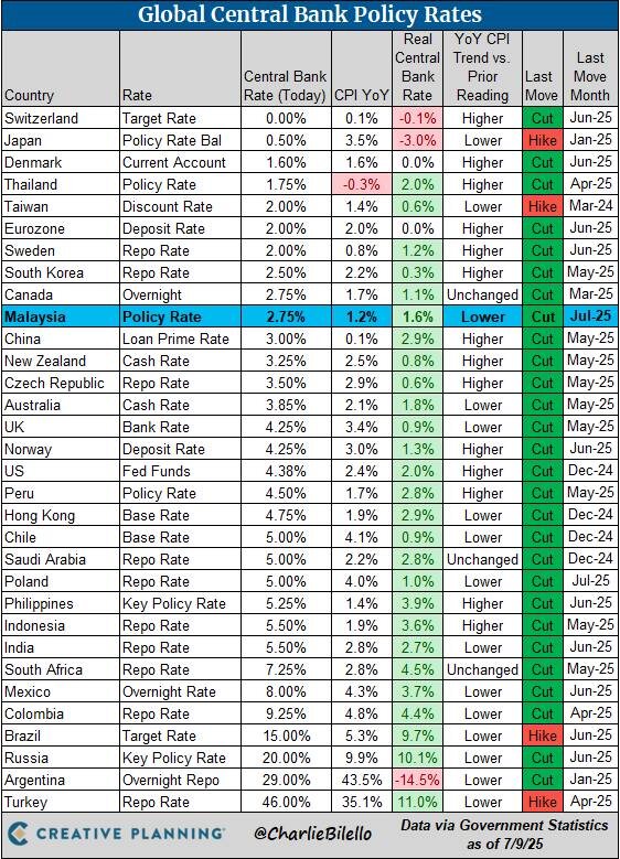 Мировые ставки: кто режет, а кто дожимает — и почему это всё имеет значение для нас Если смотреть на карту центробанков, становится очевидно: мир вступил в фазу снижения ставок. Причём не вяло, а агрессивно — почти все развитые страны уже перешли к циклу смягчения. — Еврозона, Швейцария, Дания, Швеция, Канада, Южная Корея, Австралия, Великобритания, США — все уже либо режут, либо готовятся. — Даже Китай — при низкой инфляции (0.1%) продолжает смягчать, опасаясь дефляционного сжатия. — Индия, Саудовская Аравия, Южная Африка, Польша — удерживают, но не повышают. И только Бразилия, Турция и Тайвань ещё жмут на тормоза. Но есть нюанс. Несмотря на сокращения, реальная ставка (ставка минус инфляция) в большинстве стран остаётся положительной. Это значит: политика ещё не перешла в режим стимулов — просто ослабили удавку. А теперь главное: — США всё ещё выше всех в G7 (5.25%), при инфляции 3.3% — то есть реальная ставка ~2%, достаточно высокая. — Это хоть как-то удерживает силу доллар