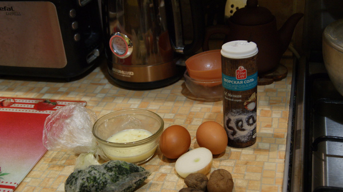 Для приготовления яичницы понадобится: немного бараньего жира и лука репчатого, две-три мелких картофелины «в мундире», два куриных яйца, резанная мороженная или свежая зелень (кинза и петрушка), морская соль.