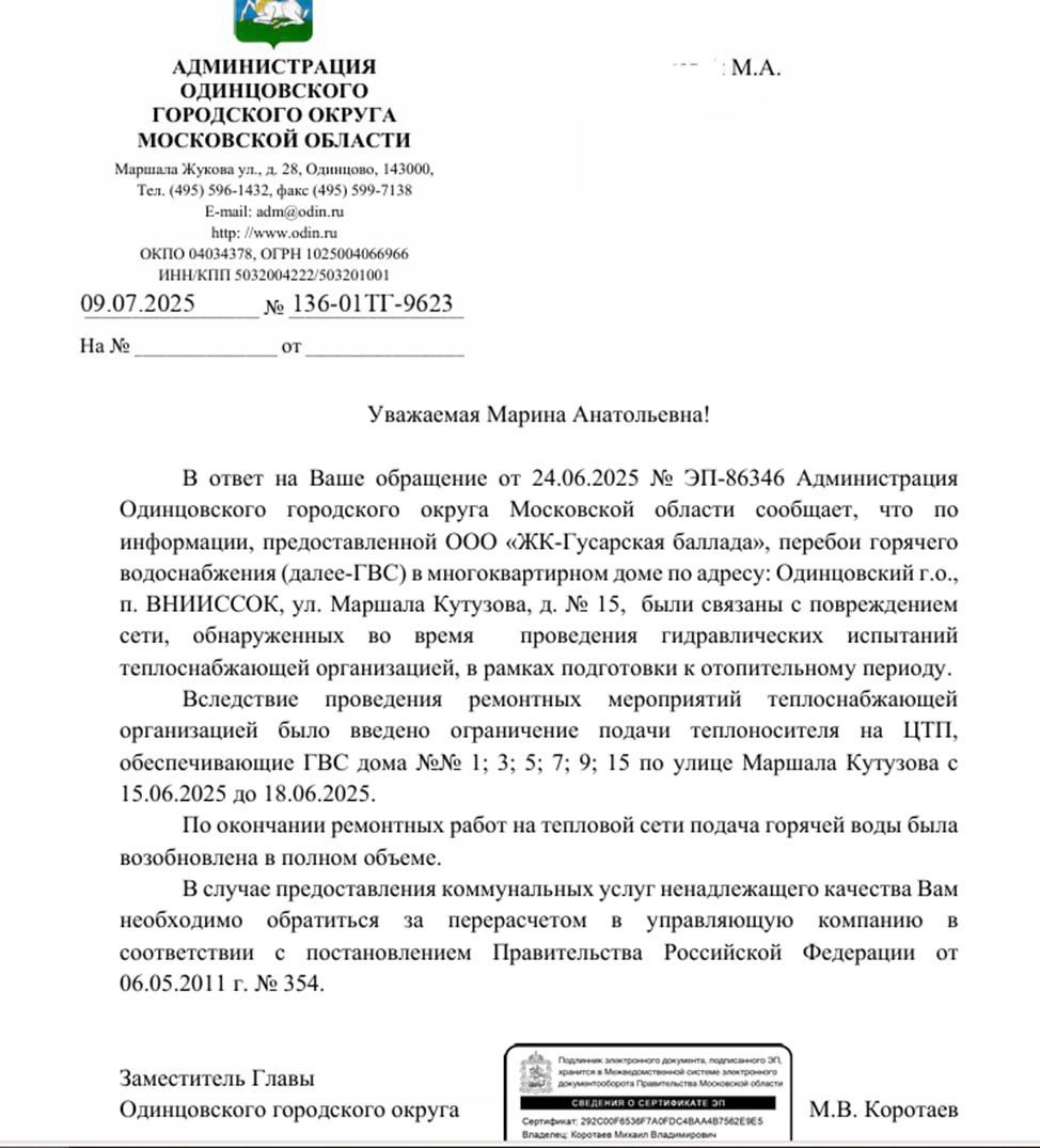 Чтобы УК выполняла свои обязанности жители вынуждены постоянно писать в чат главе округа. Очередное обращение можно увидеть по ссылке: https://t.me/ivanovlive_chat/149755 Его текст ниже: Власть проявляет полную импотенцию. Партия Единая Россия, члены которой представлены в подавляющем большинстве, зачем вы нужны? Кто Вас выбирал таких бездарей? "А может Управление ЖКХ и г-н М.В. Коротаев не в курсе, что творится в ЖК "Гусарская баллада" №1? Отключение горячей воды с 13.06.25 до 18.06.25 г. (6 дней). А потом, с момента подключения до 24.06.2025 г (7 дней) шла тёплая водичка – ниже +60С, что не соответствует качеству предоставленных услуг. Заявки на вызов сотрудников, для составления акта температуры воды, для пересчета некачественных услуг - Управляющая компания игнорировала. 24 июня выкопали яму и опять срок 30 дней, до сих пор (10.07.2025) сбои с горячей водой. Об этом есть много жалоб жильцов на горячей линии и в этом чате: Продолжение: