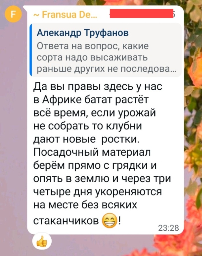 Вот вам и Африка, это вам не север🙂. Там совершенно другие способы разведения растений. Александр @Trufanich чаще общается в Ватсапп и очень редко рассказывает свои мысли. Здесь я не удержалась и мне захотелось, чтобы об этом знали как можно больше, возможно и вас натолкнет на размышления и дискуссию. "Ответа на вопрос, какие сорта надо высаживать раньше других не последовало🤷 Скорее всего это я неправильно сформулировал. А правильнее было бы обсудить часто задаваемый вопрос - когда убирать урожай батата. Самый лучший ответ дал авторитетный эксперт по этому вопросу - Франсуа Дембеле. Он имеет богатый опыт выращивания батата как в нашей Сибири, в Иркутске, так и на родине в Мали. И если для Иркутска это тогда, когда невозможно уже никак поддерживать положительную температуру в теплице, для Африки, по его выражению, - когда кушать захотел, то пошёл и накопал столько, сколько надо на данный момент 🤗. Это конечно шутка 😜. Но как сегодня любят говорить - в каждой шутке, есть доля...