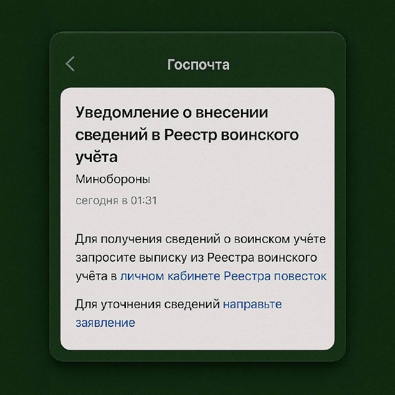 В последние дни многим начали приходить уведомления на Госуслугах: «Для получения сведений о воинском учёте запросите выписку… в личном