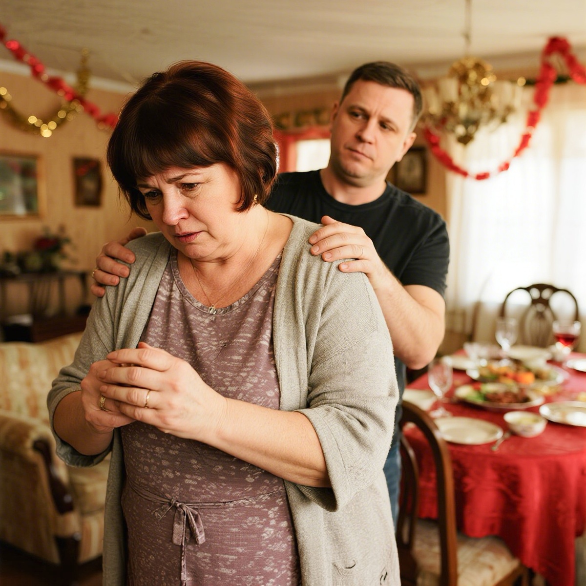 Вечером, когда гости разошлись, Анна сидела на кухне и пила чай. Сергей подошёл к ней.