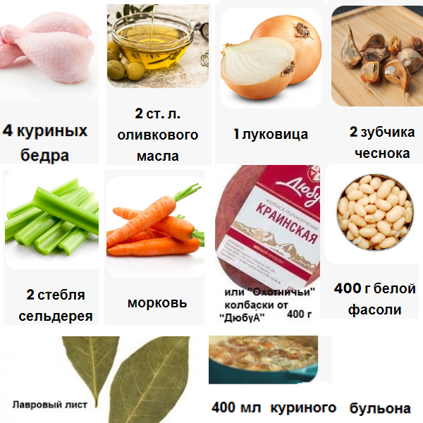 Колбаса кажется простым и обыденным продуктом, но на самом деле ее роль в кулинарии намного шире, чем мы думаем. Мало кто задумывается, что колбаса не только самостоятельная закуска, но и может быть одним из основных ингредиентов в самых разных блюдах, обогащая их вкус и текстуру. Вот только один пример – французский кассуле. И, если вы любите готовить, а ваш дом наполнен вкусными ароматами, вам обязательно стоит попробовать это блюдо. Откройте для себя одну из вариаций традиционного кассуле. Этот рецепт сочетает в себе нежные кусочки курицы, пикантные колбаски и тающую во рту фасоль в ароматном соусе. Идеальное блюдо для любителей сытной кухни. Вот все, что вам понадобится для приготовления этого рецепта кассуле. 5 шагов, и кассуле готов! Шаг 1 В жаровне разогрейте оливковое масло на среднем огне (можно любое масло без выраженного запаха). Добавьте куриные бедрышки и колбаски и обжарьте с обеих сторон. Выньте их из жаровни и отложите в сторону. Шаг 2 В ту же жаровню положите лук, чес