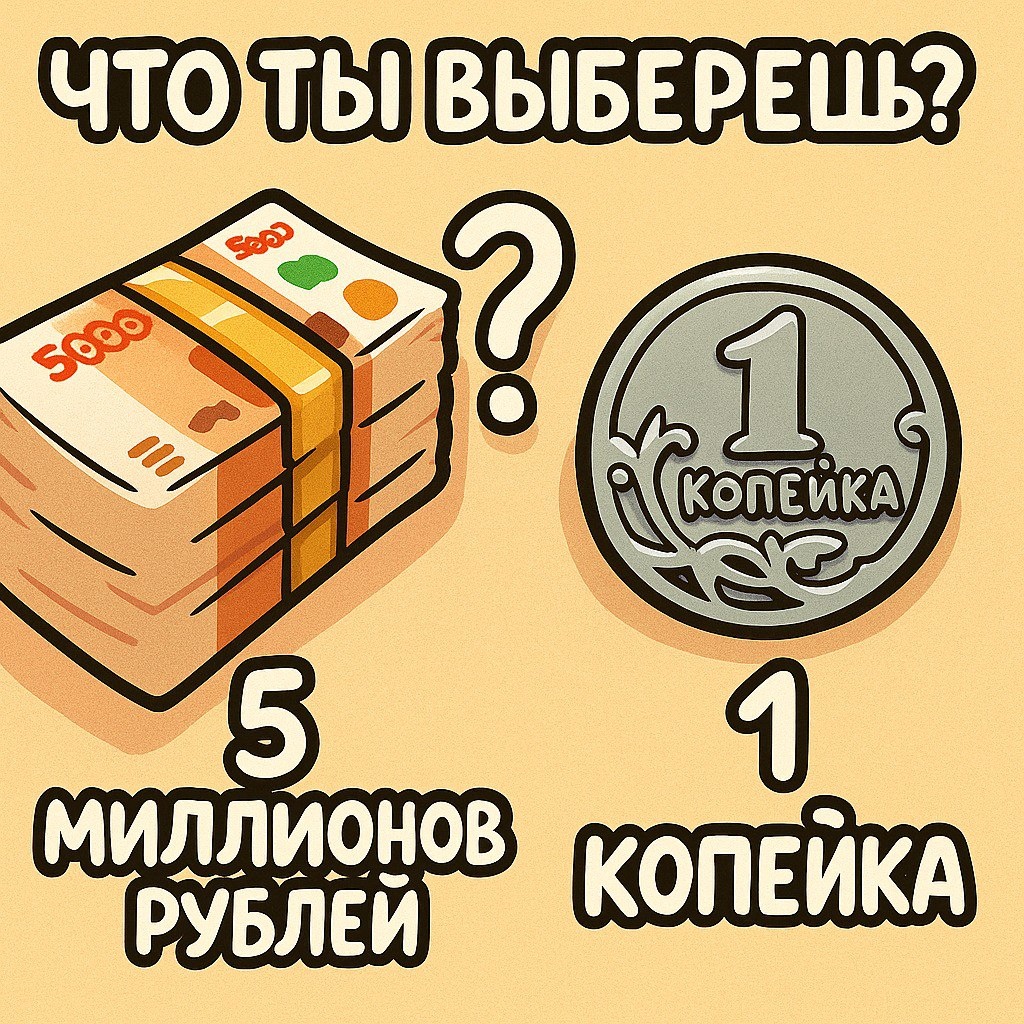 5 МИЛЛИОНОВ РУБЛЕЙ или 1 КОПЕЙКА? (сила сложного процента) Если я вам предложу 5 миллионов рублей или 1 копейку, которая каждый день умножается на 2. ЧТО ВЫ ВЫБЕРЕТЕ?🤫 ☝Выбор кажется настолько очевидным, что тут даже думать не нужно. Но он очевиден, если "НЕ СЧИТАТЬ". Предположим, что вы выбрали 5 миллионов, а я 1 копейку. ЧЕРЕЗ 1 ДЕНЬ. У меня - 2 копейки. У вас - 5 миллионов. ЧЕРЕЗ 7 ДНЕЙ. У меня 1 рубль 28 копеек. У вас - 5 миллионов. (Тут я бы уже мог усомниться в своем выборе и бросить это дело😭😭😭). ЧЕРЕЗ 14 ДНЕЙ. У меня 163 рубля. У вас 5 миллионов. ЧЕРЕЗ 21 ДЕНЬ. У меня 20971 рубль. У вас 5 миллионов. (Я всё ещё сомневаюсь в своём выборе) ЧЕРЕЗ 28 ДНЕЙ. У меня 2,68 миллиона. У вас 5 миллионов (уже интереснее😋😋😋) ЧЕРЕЗ 30 ДНЕЙ. Плоды моего ожидания вознаграждены. У меня 10,74 миллиона. У вас 5 миллионов.🕺🕺🕺 Вот она сила сложного процента и накопительного эффекта. А есть ли способ каждый день умножать свой капитал на 2? Нет! Но мы и живём не 30 дней, у нас гораздо бо