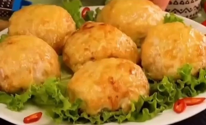 Разрезаем куриное филе вдоль, не до конца, и отбиваем до тонкости. Выкладываем в половник или небольшую миску, чтобы получилась форма чаши. Мелко нарезаем лук и обжариваем его до мягкости. Добавляем нарезанные грибы, соль и перец, жарим до испарения жидкости и лёгкой румяности. Начиняем курицу грибной смесью, закрываем и формируем округлую котлету. Выкладываем на противень свёрнутыми краями книзу, смазываем растопленным сливочным маслом и посыпаем тёртым сыром. Запекаем в разогретой духовке при 180°C около 20 минут, до золотистой корочки. Всем мира, добра, красоты!