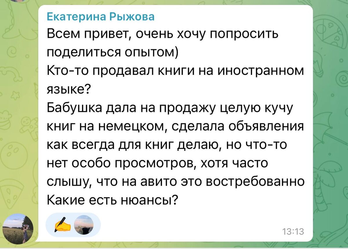 Самый важный момент при продаже иностранных книг, которые могут здесь и сейчас не искать - это подумать какие ключевые слова можно вписать, чтобы тем, кто на Авито есть ваша книга могла показаться Я если размещала иностранные книги, то название либо переводила на русский, либо писала, что это за книга Например, была книга про гобелены на венгерском (логично, что ее не искали по заголовку на обложке) и я в заголовке в начале сразу вставила Гобелены И человек ее так увидел и сказал, что книга очень редкая и он счастлив, что ее купил