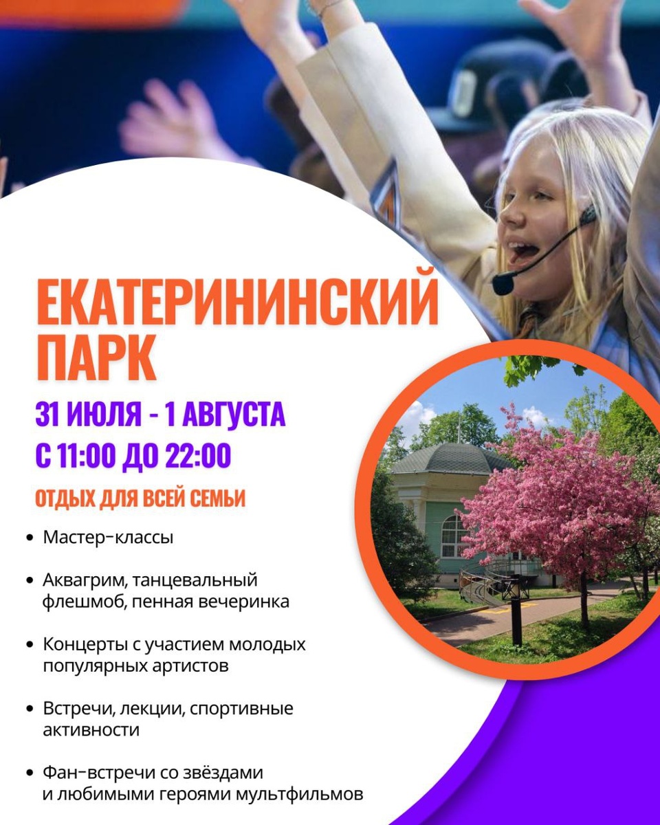 Уважаемые жители! ✨Спешу сообщить об одном из самых ярких событий этого лета на территории нашего района! 31 июля – 1 августа 2025 года состоится Международный фест-форум «Голоса Мира» — уникальное событие, которое объединит таланты со всего мира! В программу фестиваля в Екатерининском парке будут входить: 🤩мастер-классы от заслуженных деятелей культуры, искусства и спорта, концерты с участием молодых популярных артистов 🤩встречи с представителями ведущих музыкальных лейблов, 🤩лекции о здоровье, воспитании, секретах этикета и успешного бизнеса, 🤩спортивные активности, фан-встречи со звёздами и любимыми героями мультфильмов Проект поддерживает детей и подростков, особенно тех, кто нуждается в особом внимании. Здесь каждый талант может проявить себя и показать свои способности! 📅Дата: 31 июля – 1 августа 2025 года; ⏰Время: 10:00 – 22:00 📍Место: Екатерининский парк Метро: Достоевская, Проспект Мира.